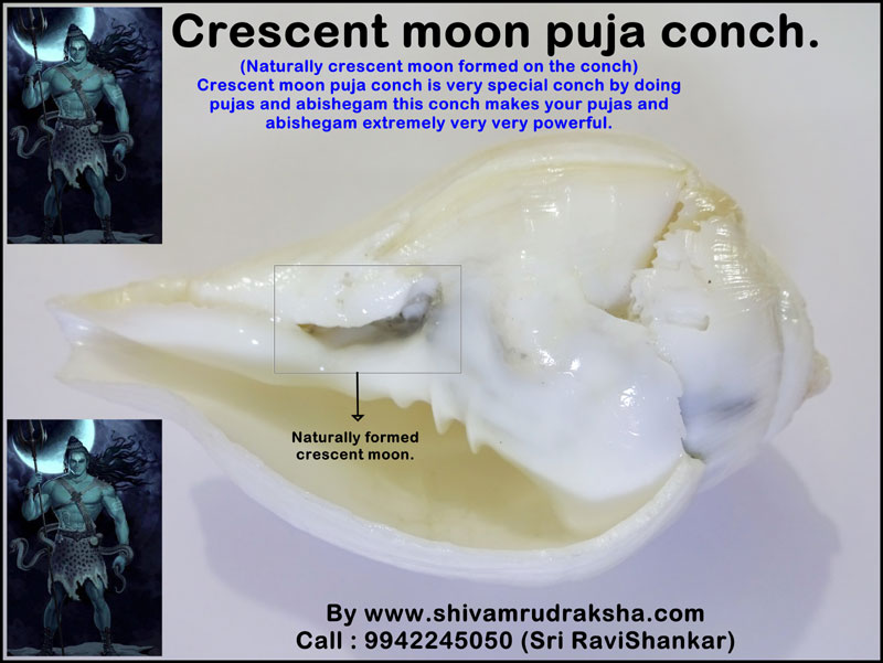 Naturally crescent moon formed on the conch. Crescent moon puja conch is very special conch by doing pujas and abishegam this conch makes your pujas and abishegam extremely very very powerful. Call : 9942245050 (Sri RaviShankar)