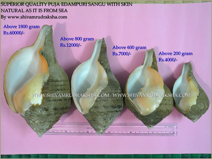 This is superior super fine quality collection of edampuri sangu with skin for doing pujas. There are collection of 200 grams to 2000 grams edampuri sangu. This edampuri sangu are as it is natural from sea only simple cleaning is done. This sangu gives very good positive vibration.