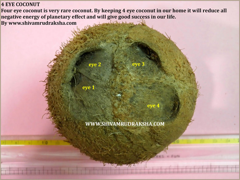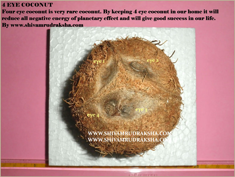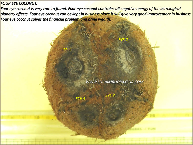 Four eye coconut is very rare to found. Four eye coconut controles all negative energy of the astrological planetry effects. Four eye coconut can be kept in business place it will give very good improvement in business. Four eye coconut solves the financial problem and bring wealth.