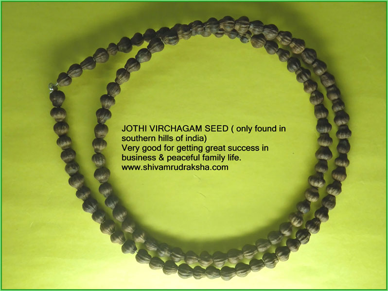 Jothi virchagam is very very powerful seed found only in southern mountain hills in india. This seed jothi virchagam is grown under the blessing of lord shiva. By wearing the mala made by jothi virchagam seed we could over come all difficulties in business and get great success in business and get very good peaceful life. By wearing jothi virchagam seed mala no black magic and evil eyes will affect us. Mala is made by collection of 108+1 jothi virchagam seeds.