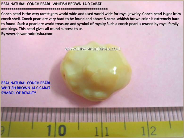 Conch pearl is the very rarest gem world wide and used world wide for royal jewelry. Conch pearl is got from conch shell. Conch pearl are very hard to be found and above 6 carat perfect whitish brown color is extremely hard to found. Such a pearl are world treasure and symbol of royalty.Such a conch pearl is owned by royal family and kings. This pearl gives all round success to us.