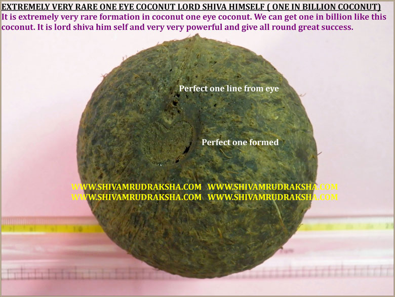 One eye coconut is very very rare. It occurs no more than one time within several millions of normal coconut. One-eyed coconuts are regarded highly by various cultures as a bringer of good-luck and prosperity and stops all black magic and evil eyes. This one eye coconut removes all negative energy form the house and fills the house with high level of positive energy. One eye coconut gives great success in business. One eye coconut is very good for doing lord shiva pujas.