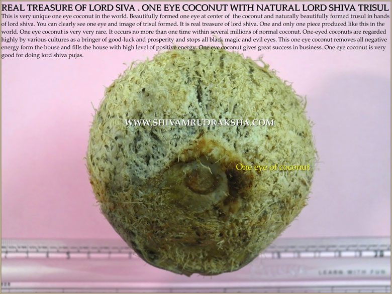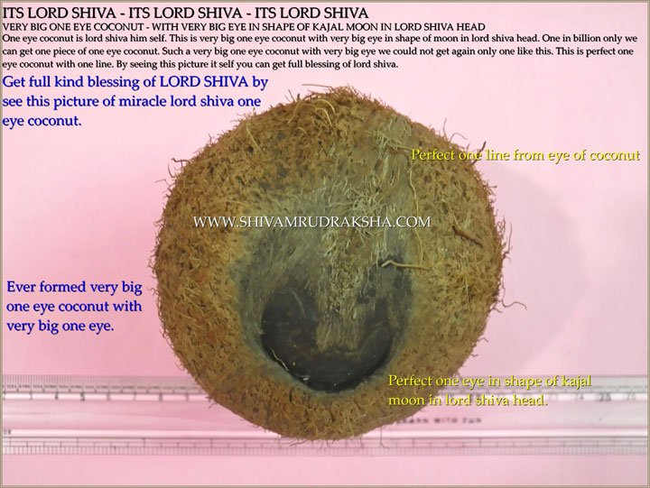 One eye coconut is lord shiva him self. This is very big one eye coconut with very big eye in shape of moon in lord shiva head. One in billion only we can get one piece of one eye coconut. Such a very big one eye coconut with very big eye we could not get again only one like this. This is perfect one eye coconut with one line. By seeing this picture it self you can get full blessing of lord shiva.