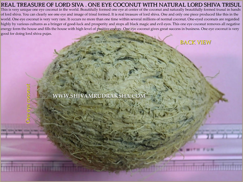 This is very unique one eye coconut in the world. Beautifully formed one eye at center of the coconut and naturally beautifully formed trusul in hands of lord shiva. You can clearly see one eye and image of trisul formed. It is real treasure of lord shiva. One and only one piece produced like this in the world. One eye coconut is very very rare. It occurs no more than one time within several millions of normal coconut. One-eyed coconuts are regarded highly by various cultures as a bringer of good-luck and prosperity and stops all black magic and evil eyes. This one eye coconut removes all negative energy form the house and fills the house with high level of positive energy. One eye coconut gives great success in business. One eye coconut is very good for doing lord shiva pujas.