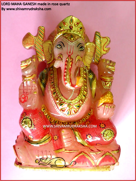 LORD MAHA GANESH made in natural rose quartz. Ganesh represents water (Apas), the energy of fulfilment; he is the Master of Varuna, god of waters. This is why, when the Ganesha Chathurti festival ends, clay statues of god Ganesh must be brought to the sea and immersed to be dissolved.