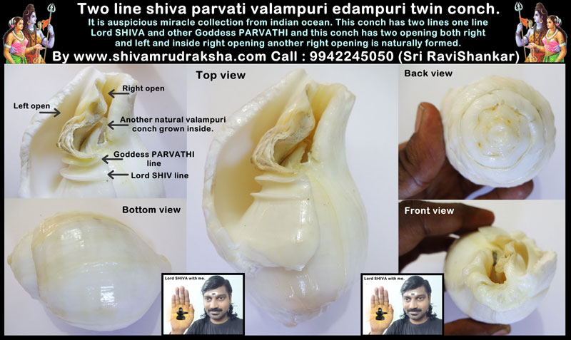 It is auspicious miracle collection from indian ocean. This conch has two lines one line Lord SHIVA and other Goddess PARVATHI and this conch has two opening both right and left and inside right opening another right opening is naturally formed. This conch gives complete full and full blessing of Lord SHIVA and Goddess PARVATHI This conch is life time collection same like other conch never we can get. By keeping this conch with us will give very very good health, wealth, success, happiness and peace.